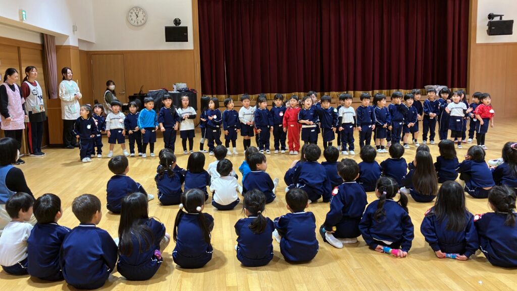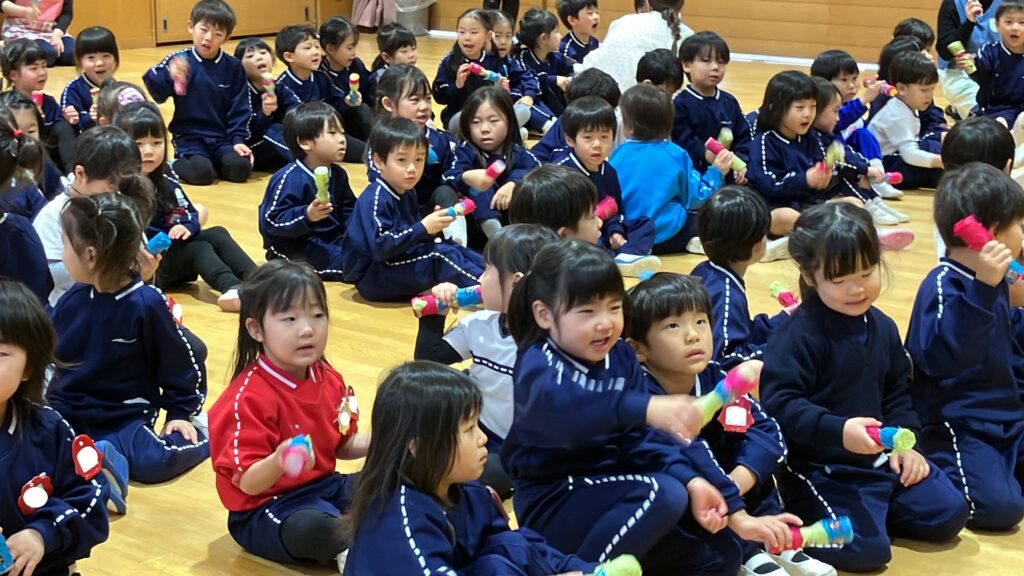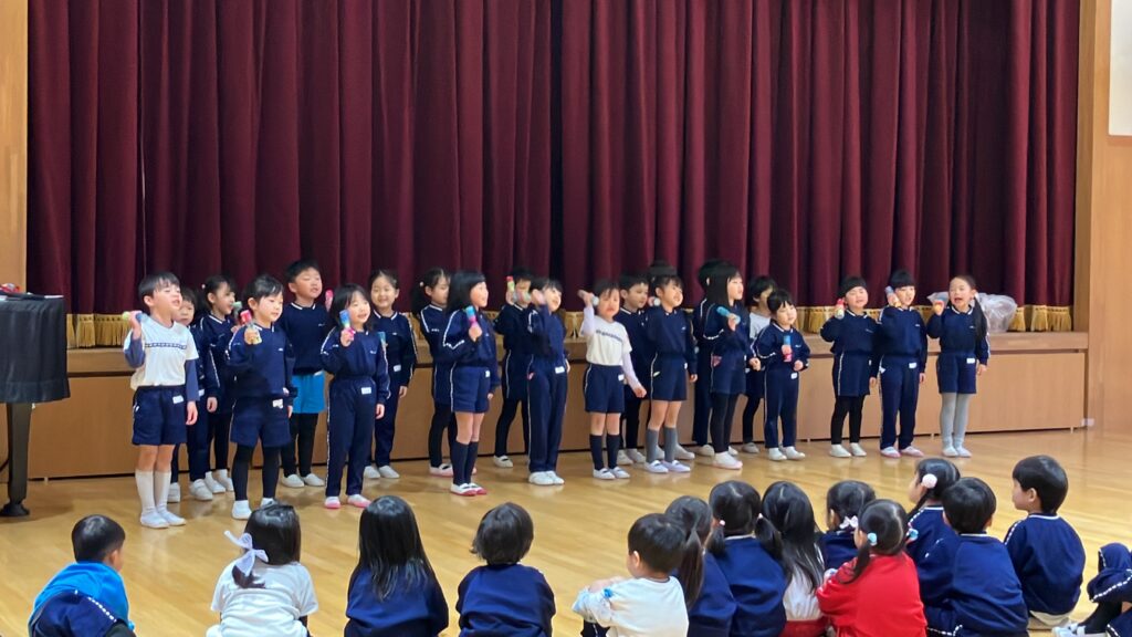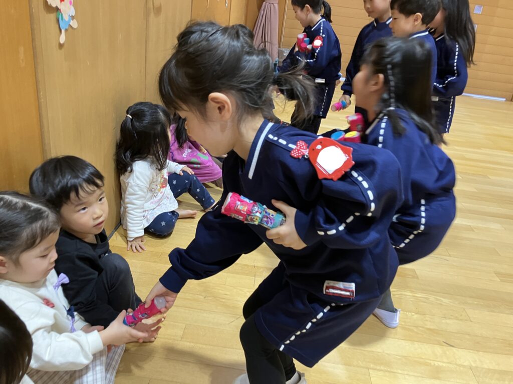 さらに、年長組さんから年中組、年少組や保育課程のお友達へマラカスのプレゼントがあり、みんなでマラカスを振って「あわてんぼうのサンタクロース」を歌い楽しみました。