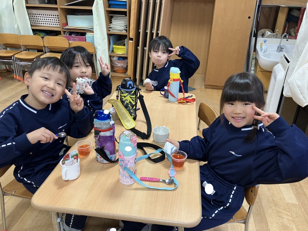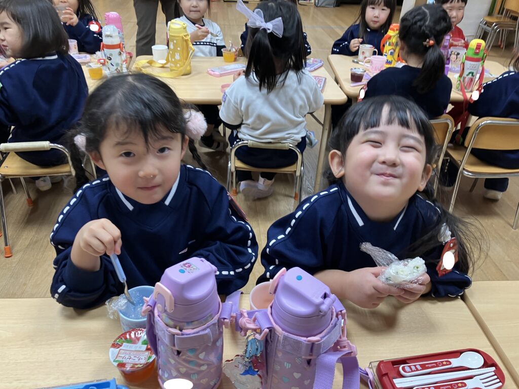 おやつの時間には、今日だけ特別のゼリーとおにぎりです。サンタさんが持って来てくれたのかな?みんな「美味しいね♡」と友達同士で会話を楽しんでいました。