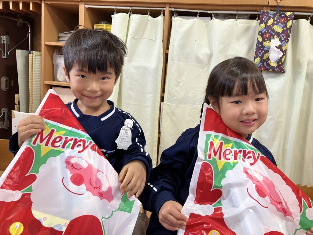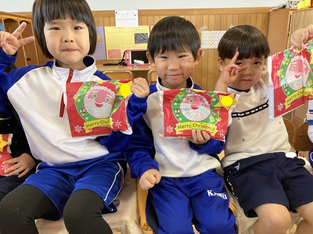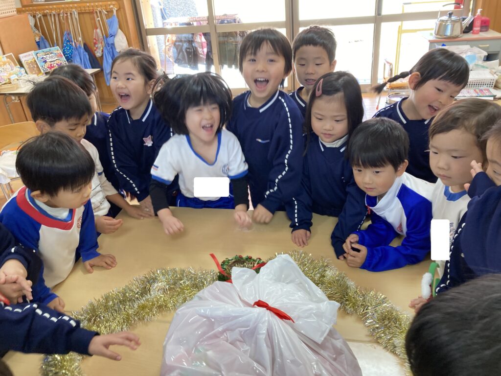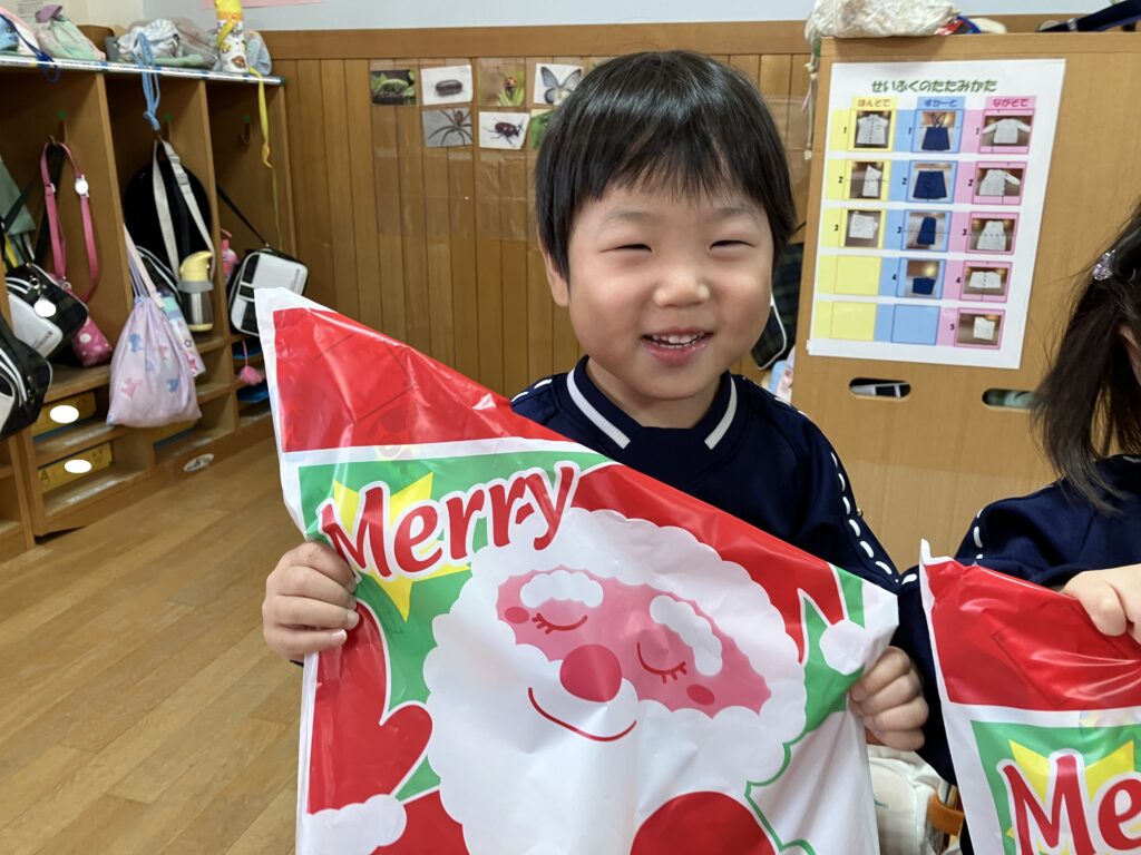 各クラスでは、「クリスマスは24日がイブ(前夜)で25日がお祝いの日だよ!」という話をしました!すると、「サンタさんからおもちゃを貰うんだ~!」「サンタさんに自転車が欲しいってお手紙を書くんだ~!」と気持ちがどんどん高まっている子どもたちです❤