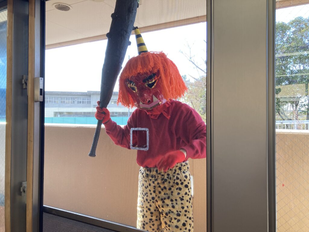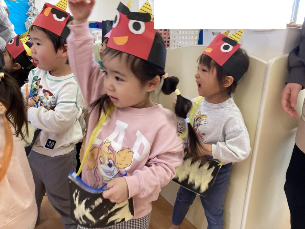 各クラス製作で作った鬼のお面を被り、豆まきバッグを持って鬼退治の準備完了!
